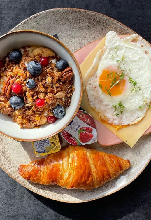 Brood met ham, kaas en gebakken ei | croissant met jam |
