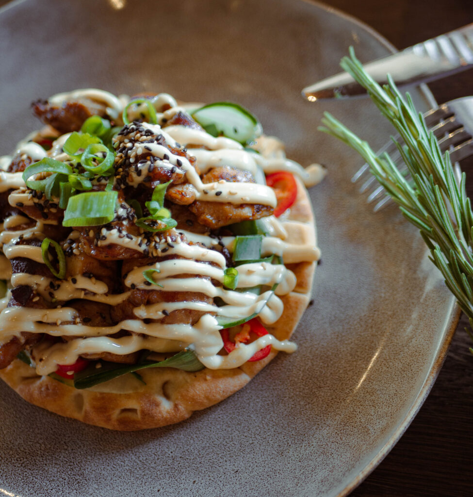 Pita | gemarineerde kippendij | zoetzure komkommer | rode peper